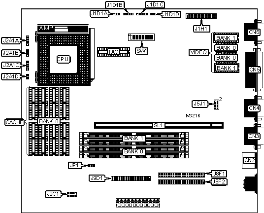 Floppy drive interface, IDE interfaces (2), parallel port, PS/2 mouse port, serial ports (2), 8514 video pass through connector, VGA port, riser slot