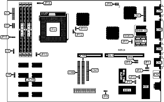 Floppy drive interface, green PC connector, IDE interfaces (2), parallel port, PS/2 mouse port, serial ports (2), feature connector, VGA port, riser slot |