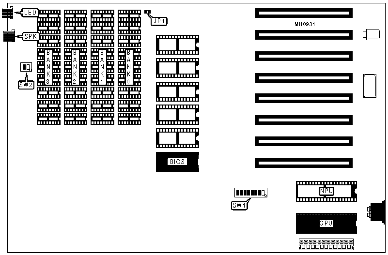 Note:System memory is factory configured at 640KB and should not be removed. Setting JP1 open forces the system to only recognize 256KB.