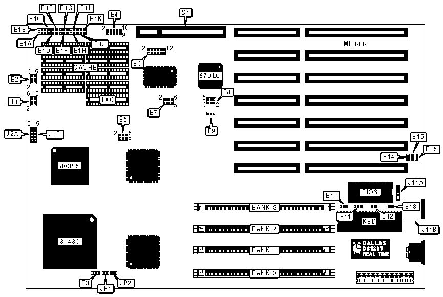 Notes: Pins indicated should be in the closed position. Early versions of the board (model DT-LB133) do not support the 80486 series processor. | ||||||