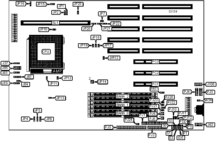 32-bit PCI slots (3), floppy drive interface, IDE interface, parallel port, PS/2 mouse interface, serial ports (2), cache clot
