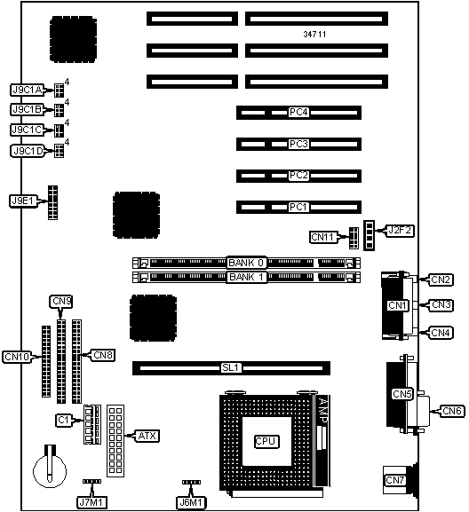 32-bit PCI slots (4), floppy drive interface, game/MIDI port, IDE interfaces (2), parallel port, PS/2 mouse port, serial ports (2), cache slot, ATX power connector, line in, line out, microphone in, wavetable connector, audio in – CD-ROM