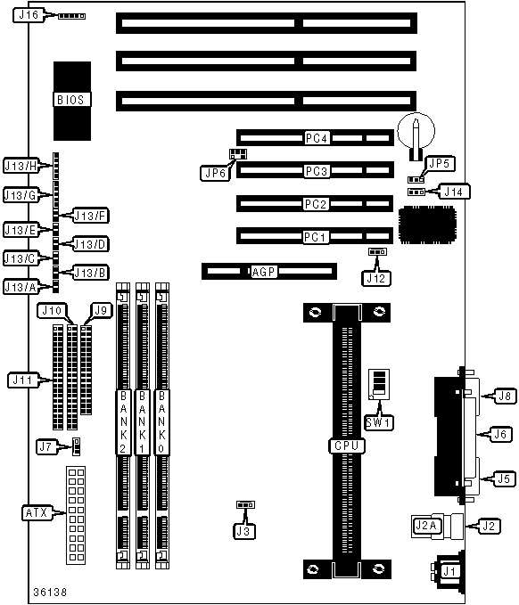 32-bit PCI slots (4), floppy drive interface, IDE interfaces (2), parallel port, PS/2 mouse port, serial ports (2), USB connectors (2), ATX power connector, AGP slot |