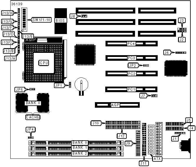 32-bit PCI slots (4), floppy drive interface, green PC connector, IDE interfaces (2), parallel port, PS/2 mouse port, serial ports (2), IR connector, USB connectors (2), ATX power connector, AGP slot,