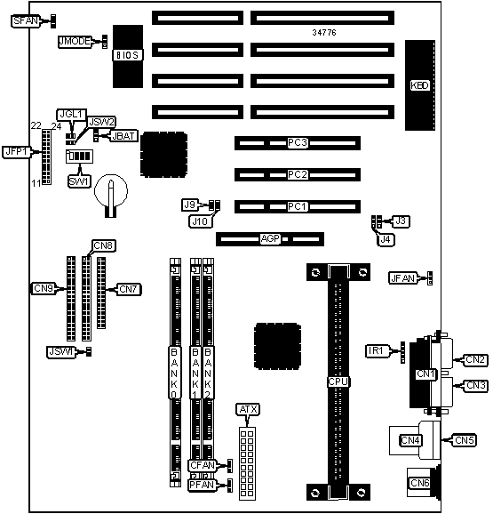 32-bit PCI slots (3), floppy drive interface, IDE interfaces (2), parallel port, PS/2 mouse port, serial ports (2), IR connector, USB connectors (2), ATX power connector, AGP slot |