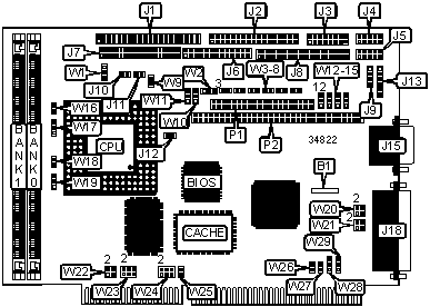 Floppy drive interface, green PC connector, IDE interface, SCSI interface, parallel port, PS/2 mouse interface, serial ports (2), VGA feature connector, VGA port, flat panel connector, PC/104 connectors (2)
