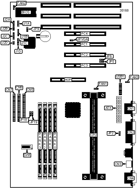 32-bit PCI slots (4), floppy drive interface, IDE interfaces (2), parallel port, PS/2 mouse port, serial ports (2), USB connector (2), IR connector, AGP slot, ATX power connector, green PC connector