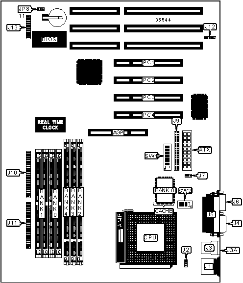 32-bit PCI slots (4), floppy drive interface, IDE interfaces (2), parallel port, PS/2 mouse port, serial ports (2), IR connector, USB connectors (2), ATX power connector, AGP slot