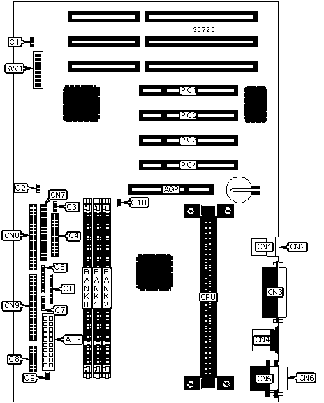32-bit PCI slots (4), floppy drive interface, IDE interfaces (2), parallel port, PS/2 mouse port, serial ports (2), IR connector, USB connectors (2), ATX power connector, AGP slot |