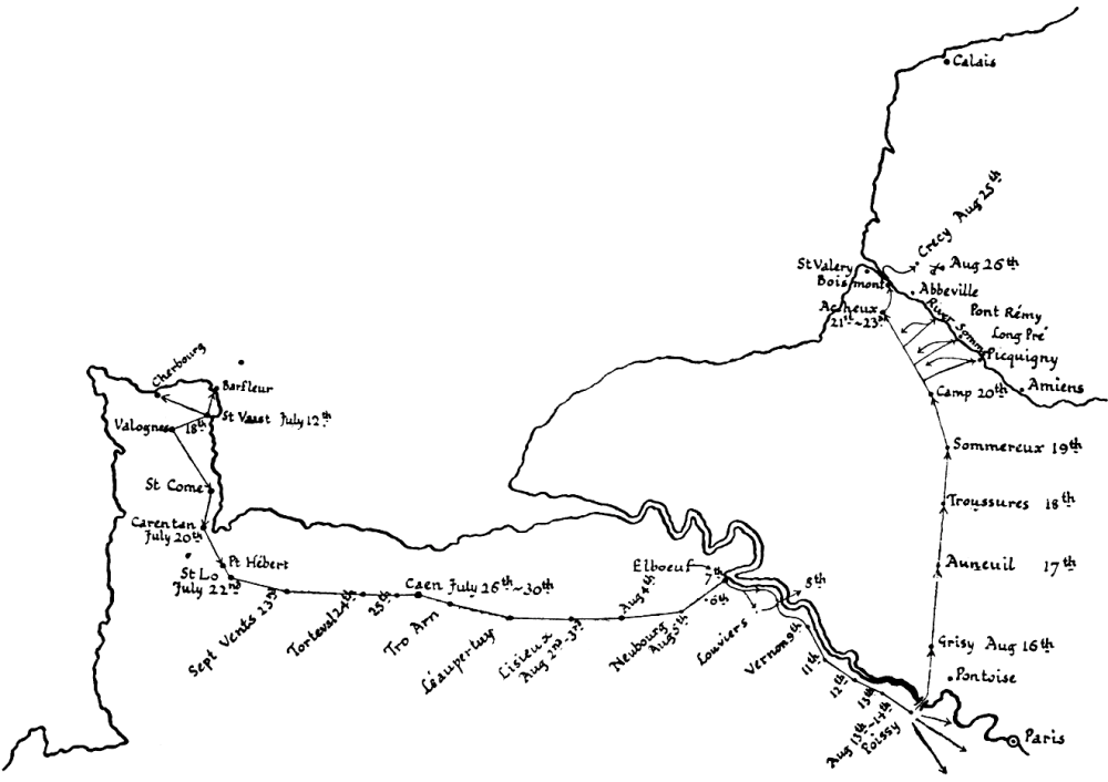 The campaign, as a whole, resolves itself (up to and including the Battle of Crécy, which is the subject of this book, and excluding the continuation of the march after Crécy, and the capture of Calais) into an advance from the Channel coast to Paris, and a retreat from Paris to the Channel again, the two portions being divided by the crossing of the Seine at Poissy. The advance leaves the coast at the summit of that projection of Normandy called the Cotentin, and proceeds a little south of east towards Paris, the walls of which are reached by its outermost skirmishers, while the main army crosses the Seine at Poissy. The retreat is effected from Poissy northward to the victorious field of Crécy, and later from Crécy, on the same line, to the siege and capture of Calais.
