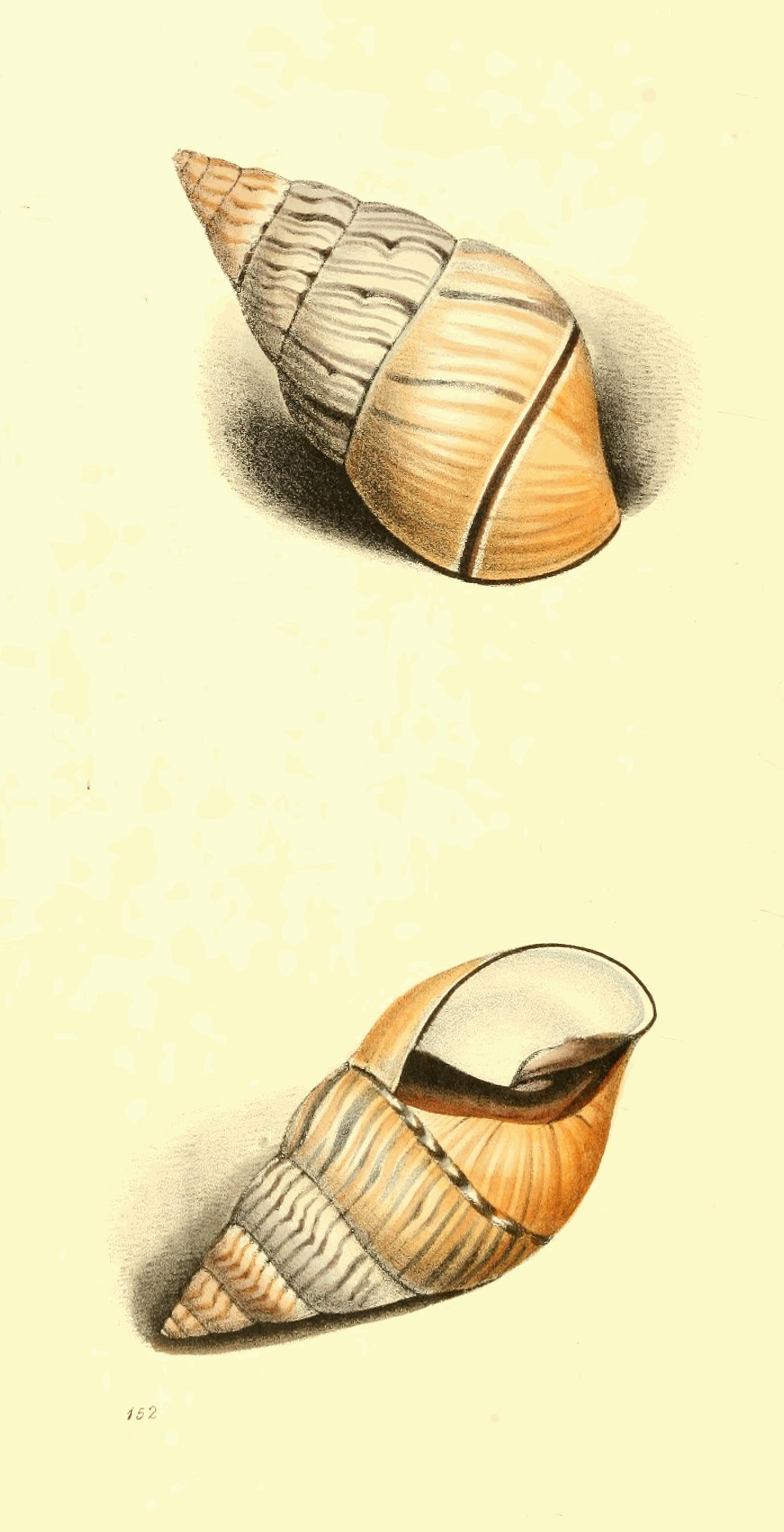 The shell generally known as the Ach. virginea (Bulla virginea Lin.) is so common, that few collectors do not possess it. The varieties, however, of this species are rare, and differ so remarkably in their colouring, as to require illustration. Several kindred species of this family I have already described; and on the same principle of establishing specific distinctions from formation instead of colour, I shall now endeavour to point out those characters which are common, more or less, to all the varieties of this species, and which distinguish it from its allies. A. virginea may be known by the comparative shortness of the basal whorl, which in general is broader than high; the margin of the outer lip is entire, and sloping in an oblique direction; the aperture is wide, and nearly round; the lower part of the columella takes a concave direction, and between its base and that of the outer lip is a very deep notch. The basal whorl is so broad that the shell, if placed on a table with its mouth downwards, will remain erect.