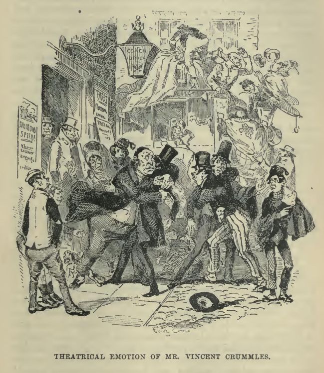 The new-comers were received with universal approbation, and Mr. Bonney bustled up to the top of the table, took off his hat, ran his fingers through his hair, and knocked a hackney-coachman’s knock on the table with a little hammer: whereat several gentlemen cried ‘Hear!’ and nodded slightly to each other, as much as to say what spirited conduct that was. Just at this moment, a waiter, feverish with agitation, tore into the room, and throwing the door open with a crash, shouted ‘Sir Matthew Pupker!’