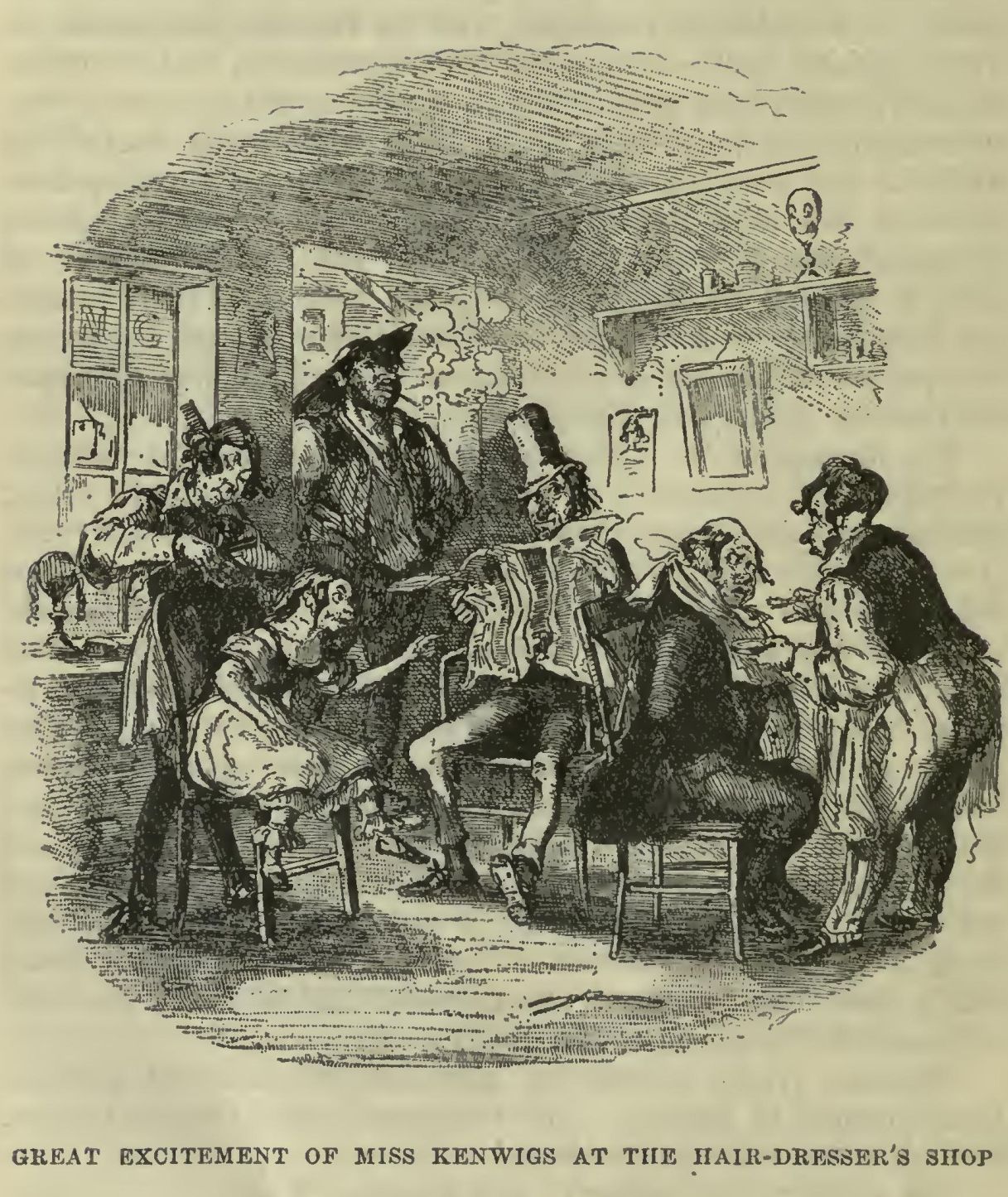 Noggs gave vent to his usual grunt, as much as to say ‘I thought so!’ and, the ring being repeated, went to the door, whence he presently returned, ushering in, by the name of Mr. Bonney, a pale gentleman in a violent hurry, who, with his hair standing up in great disorder all over his head, and a very narrow white cravat tied loosely round his throat, looked as if he had been knocked up in the night and had not dressed himself since.