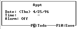 In the above Day View screen, the date of the appointments and ToDo's is displayed in the upper left corner, above its week number. The system date (i.e., the current date), time, and week number are displayed in the top right of the screen. Then come the appointments for the selected date, sorted by time, followed by incomplete ToDo's for that date or earlier, sorted by priority. Hitting (H) hoists the first ToDo to the top of the screen, and hitting (H) again hoists the first appointment to the top (similar to toggling between (F9) and (F10) in Appointment).