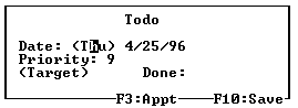 If I really wanted a ToDo, but chose Day by mistake, I can press (F3) at this stage to convert the Appt dialogue to a ToDo dialogue, with its Priority field filled in with whatever I've configured as my default Priority: