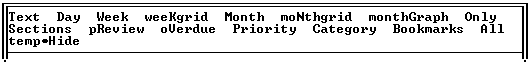 The vertical lines in the Monthly Graph View displayed on the next page show the time slots that are filled. The time intervals are set to one half hour (the dots between the hours are the half-hour indicators). These settings can be changed using the configuration file option. The TODAY marker keeps you aware of today's date. (The block cursor you see is created by a third party utility I use.) In the screen below I moved the cursor down to the item occupying the 12:00 pm slot on April 2 to see what's there. Its contents show up in highlighted text at the bottom of the screen.