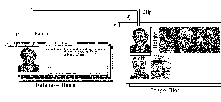Graphic showing that iPeX "clips" a portion of an image file and "pastes" it into a specific location on the screen displaying a Database Item.>