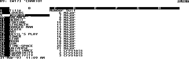 However, the real power of using 1-2-3 for tarot cards is its random number generation ability using its table look up facility. Using formulas I set up, I can randomly select a card from a subset of cards (from the fives or the "wands" suit for example) and place them on traditional tarot layouts. This random generation can also be used for self-quizzing. For example, if I used this same method to learn a language, I could randomly pick a noun or verb and hide in a nearby cell its meaning or conjugation to test myself.
