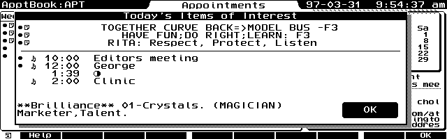 Note that, when displayed, the Appointment Book Greeting Card can contain up to two lines of about 45 characters. However, the APPTS.INI allows only single lines for each message. A tilde (~) embedded in the line forces a line break on the Greeting Card screen. (If you read D:\_DAT\APPTS.INI in MEMO, the single lines starting with "001=" appear to be two lines, but MEMO just wraps them automatically; they contain no hard carriage return.)