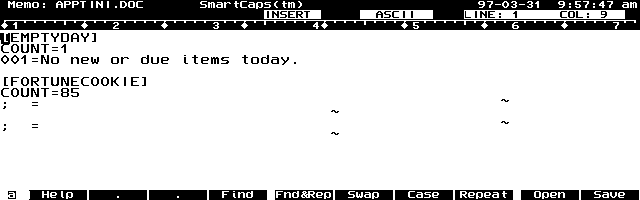 To create your own custom messages, open MEMO, open APPTS.INI as a MEMO file ((Menu) File, Open and then locate the APPTS.INI file in C:\_DAT). Edit the file by deleting each of the numbered lines which follow after the "[FORTUNECOOKIE]" and tildas at the start of the file. Save the result as a separate template file. (Note: it appears that lines in the APPTS.INI file beginning with "; " are comments and can probably be eliminated, but to be safe, I've left them.) (See Screen 6.)