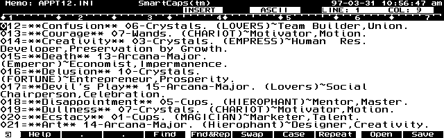 One way to learn tarot is to pick a new random card each day and pause to reflect on how the content of that card relates to the challenges and opportunities of the day. Appointment Book randomly picks one of the "[FORTUNECOOKIE]" lines in APPTS.INI to display at the start of each day on the Appointment Book Greeting Card. By filling APPTS.INI with tarot definitions, the palmtop picks the tarot card for the day. If you wanted to learn a language or discipline, this method would cause a reminder of one word or definition to pop up each day.