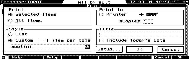 To export Smart Clipped data to a file simply tag with the space key all items you want Smart Clipped. (Tagging isn't necessary if you want to export the whole file.) Then press (Menu), File, Print and fill in appropriate boxes. Be sure to tag the Custom button in Style and select the appropriate Smart Clip. You want to print to a file. (You can leave the title blank.) When you press (F10) OK, you are prompted for a file name. (See Screen 9.) Then in MEMO, by pressing (Menu), File, Insert, and selecting the file you just named, your Database Print File output will merge with the APPTS.INI template. Make sure COUNT= has the correct number of lines. Save this new APPTS.INI in your C:\_DAT directory so that the Appointment Book will automatically draw from it when the Greeting Card is created.