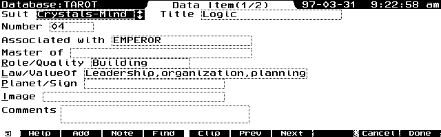 Screen 1 shows an example of a tarot card record. Each tarot card has a suit that is associated with the mind, heart, body, or spirit, or is one of the "Major Arcana" cards referring to one of 22 fundamental human archetypes. Each card also has a number associated with it or is one of four royal family cards (like a modern card deck's jack, queen, and king. In fact, modern decks originated from the tarot.) Also, as you can see from Screen 1, I use Dr. Wanless's association of the cards with business attributes.