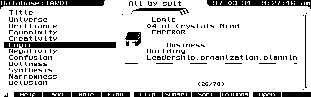 In addition to the palmtop's computing capability, the storage of information in databases makes it possible for even beginners to make use of these oracle systems. For example, DOS software or built-in palmtop applications could contain a listing of the 78 tarot cards and their basic meanings. The built-in WorldTime application lists the latitudes, longitudes, and time zones of major world cities, and is useful for astrological calculations. The meanings of planets, houses, and signs can be input to a database. In fact, with a little time to enter data, plus an understanding of how things are calculated, then the built-in applications of Lotus 1-2-3, WorldTime, HPCalc, and Database are all that one needs for making the palmtop an oracle machine.