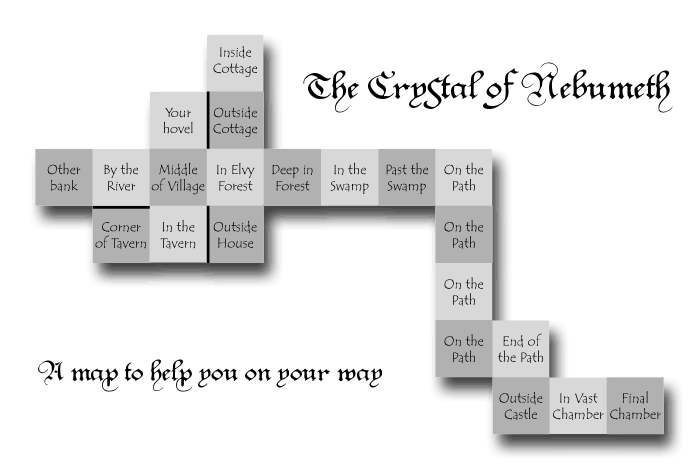 "The Crystal of Nebumeth" is a text adventure of the type that was popular in the 1980s. You know, the sort you'd load off cassette onto your Sinclair Spectrum or Commodore 64. When you begin the game, you'll see a description of your starting location and a prompt that says "What now?". Simply type, in English, what you wish to do. But keep your sentences simple: a single verb and noun will be enough. Here are some examples: