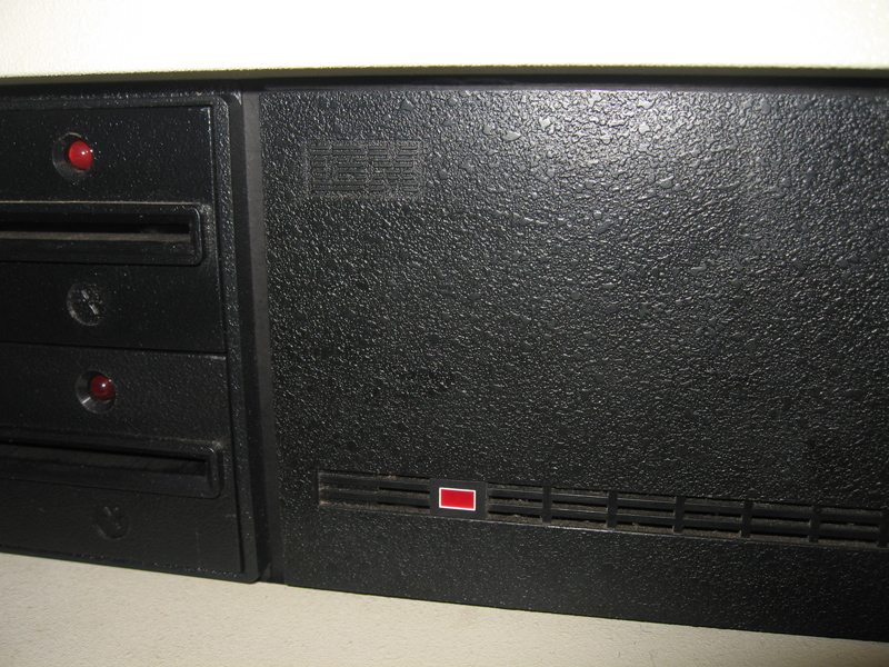 Here's a nice picture of the 5160 in action. This one has the IBM 5153 RGB colour monitor.You can tell a 5160 over a 5150 by the single floppy drive and hard drive taking the right-hand bay, as well as the badge denoting "XT" (see below). Aside from those exterior changes, from the front there's no difference.