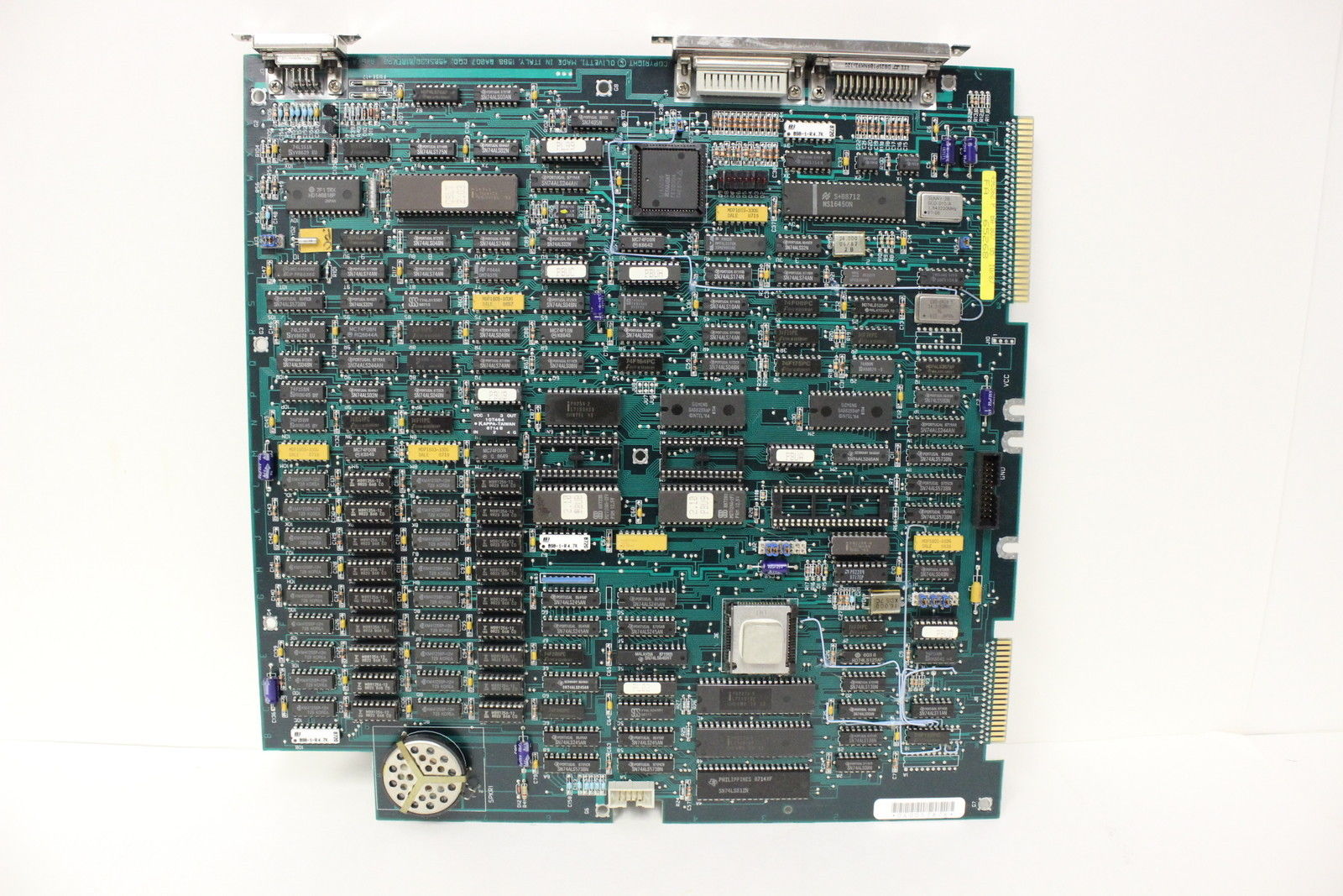 Connecting into this is a 'bus converter' board into which the video card sits. The motherboard has just three ports, visible at the top on the image to the right: 9-pin keyboard port (DE-9 female), 25-pin video output port (DE-25 female), and a 25-pin serial port (right).