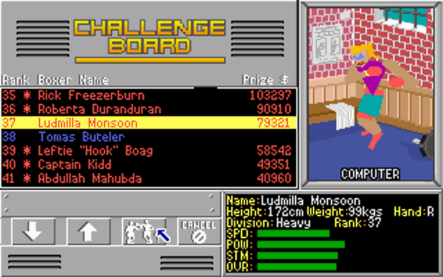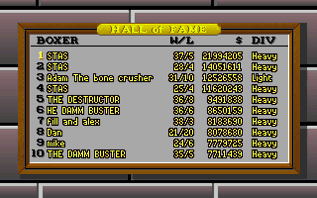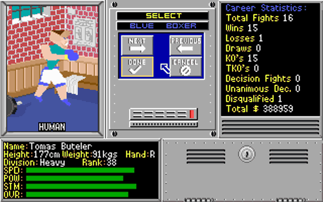 Symptom: The frame rate during the fight itself is very slow. Cause: You're probably running the game on an XT or 286 that has a low clock speed (10 MHz or lower). Resolution: Run the game on a faster computer, e.g. a 386 with 16 MHz clock speed or higher. Alternatively, you can decrease the rendering level which reduces the number of polygons that make up each character, and hence gives the CPU less to work on. Before the fight starts, go into "Controls" and where you see the icon with the 2 men, select it. Then choose either the leftmost icon to increase rendering, or the second icon to decrease it. You will see the image at the top of the screen change to show you what the boxers will look like at that rendering level.