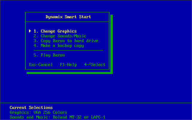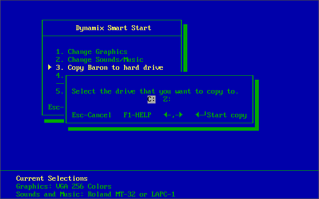 and if you try to use SUBST to mimic a subdirectory as a drive letter the install won't fail but only disk 1's contents will get installed into C:\DYNAMIX\BARON. Fortunately, it's easy to workaround these issues - just manually copy all files from the floppy disks into a directory on your hard disk (don't forget the 'TAPES' subdirectory needs to remain intact in the desination folder structure also) and it will work.