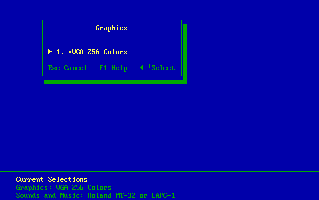 Setup options are limited to the version of the game you have: 256-colour VGA version (left), 16-colour version (right):