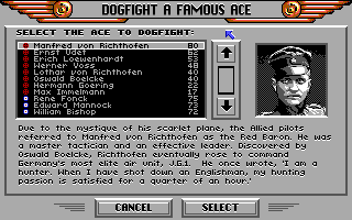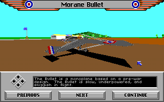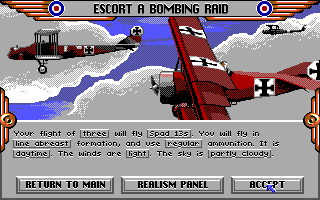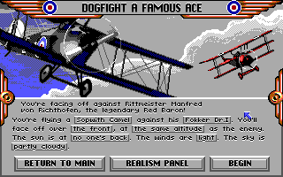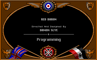 Red Baron is a World War 1 flight simulator, released by Dynamix in 1990 - the same year MicroProse bought the company. It is the start of World War 1, with aircraft technology in its infancy. Take to the skies in one of 28 different aircraft, of which the different flying characteristics of each was modeled including G effects, with the goal of defeating the enemy planes in over 40 missions.