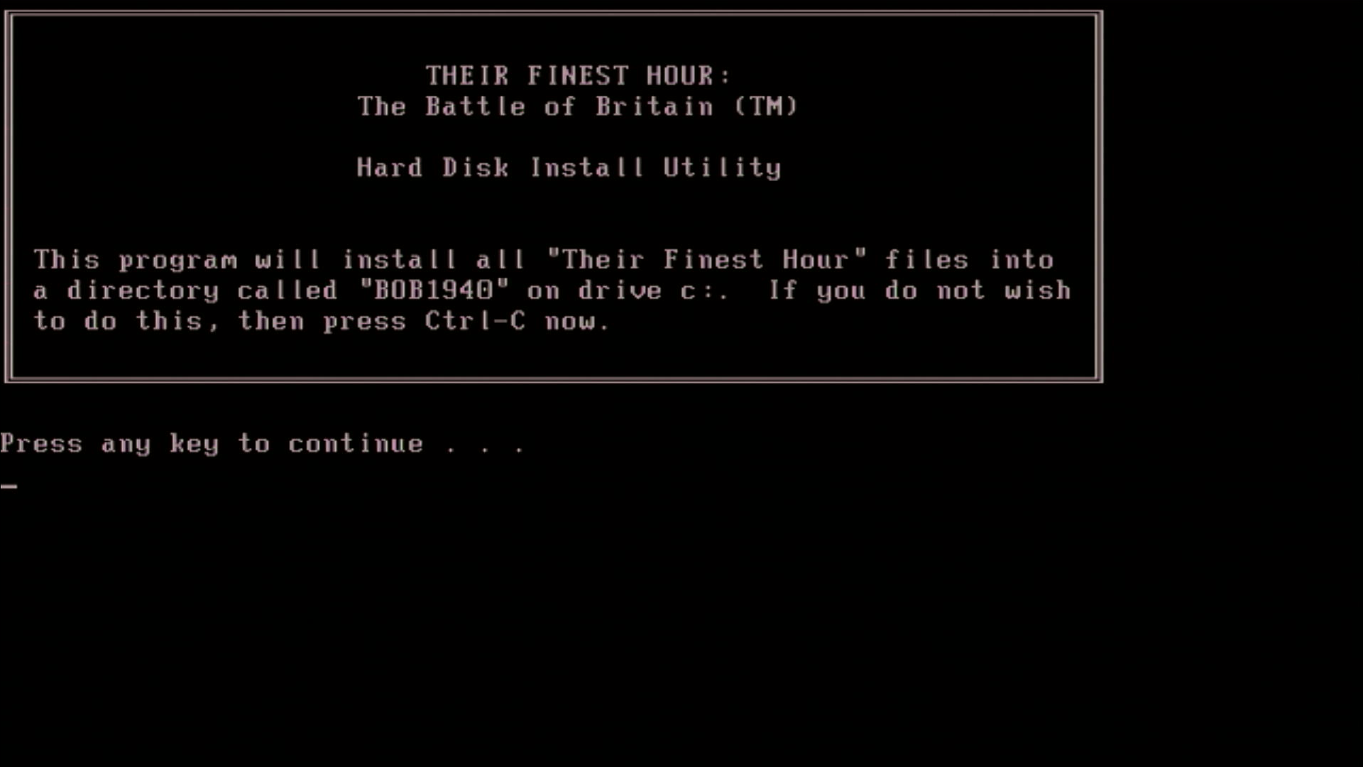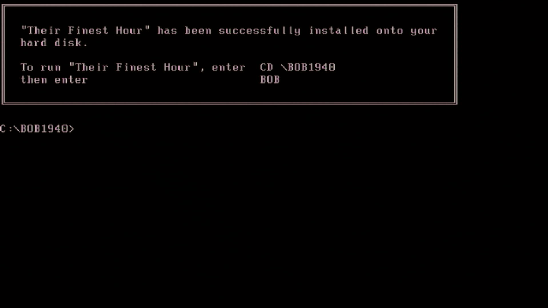 To run the game, simply run BOB either from Disk 1, or after installing to your hard disk (default directory is C:\BOB1940). If run with no command-line arguments, you will be prompted for your graphics card before the game starts. You can also run BOB in a specific configuration using the following command-line arguments: