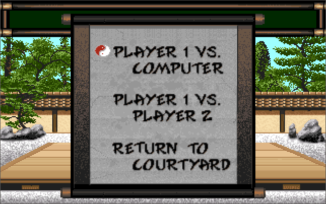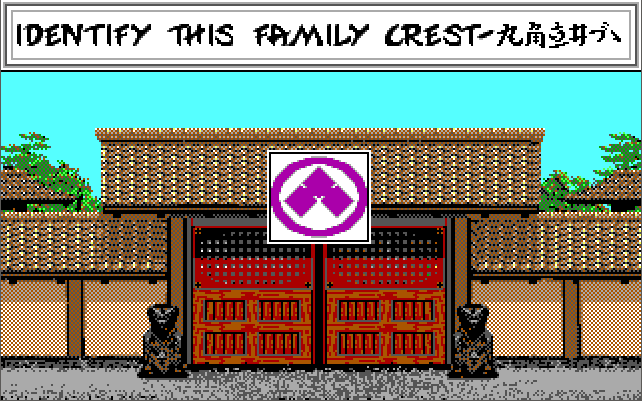 Open the game manual, and after the Table of Contents there will be page that shows 12 family crests. Locate the symbol shown in the middle of the screen and use the left and right arrow keys to alter the selected text to match the symbol. If you are correct the Courtyard doors will open and you can play the game. If you get it wrong, you will still be permitted to play, but only in practice mode in the dojos. If you try to Kumite (spar), you will be presented with this screen, and then it will ask you again to identify a family crest. Even if you get it right it won't work and will dump you back to DOS (which is a bug in the game), so you have to get it right when you first start the game: