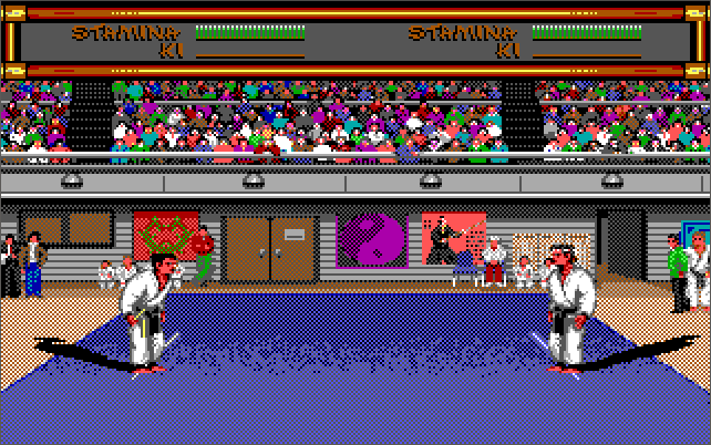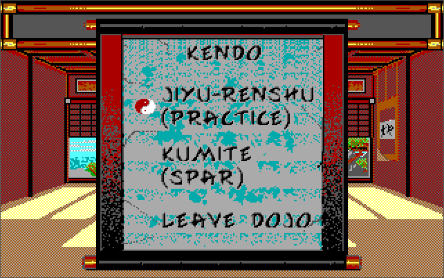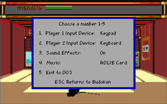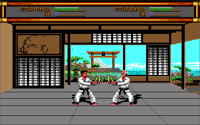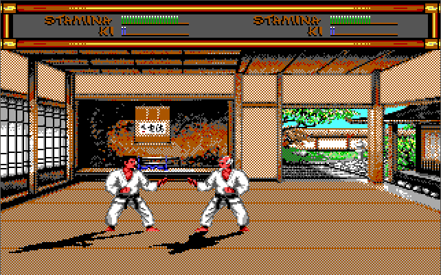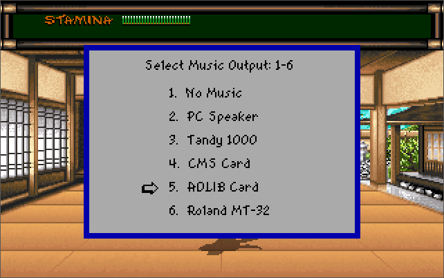 "As you will expect, Budokan can run on almost any PC, but the best hardware setup that I recommend is a 386 CPU (one of any speed) with 1 MB of memory. Run the game in VGA graphics mode to enjoy those gorgeous 256-colour backdrops painted by Mike Nowak and Michael Kosaka, along with a Roland MT-32 ("old" or "new") for audio. Make sure your PC speaker is connected and volume is up (or PC speaker emulation is enabled in DOSBox) as it is used for the digitised sound effects. The game will run at a maximum resolution of 320x200 in 256 colours. To my knowledge there are no differences between the original game launched in late 1989 and the re-release in 1993, so any game version will do. Being a fighting game, use a decent responsive analogue joystick - the keys are ok but you will probably be more accurate with a joystick.