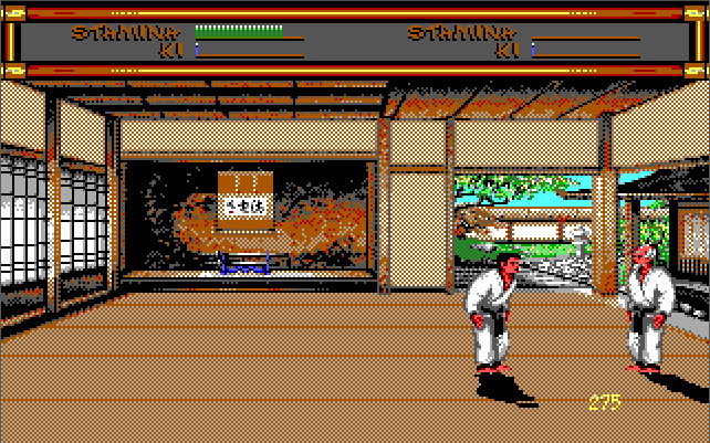 This is a more serious fighting game where it is just as important to watch your 'Ki' (energy) level as well as your stamina. During a spar, any time when you are not fighting increases your Ki. When you attack you use half your Ki, and the more Ki used the more damage that move will inflict if a hit is made - when that occurs your opponent loses half his Ki. Similarly your stamina bar is an indication of your strength and endurance - performing different moves or being struck by your opponent reduces your stamina, while resting and successfully blocking your opponent will increase your stamina. The lower your stamina, the slower your attacking and blocking moves will be.