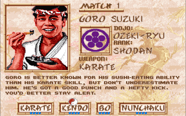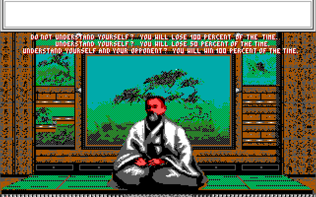 Budokan requires patience to succeed - it can be enormously frustrating if you go into this game thinking it's like Street Fighter - learn the attacking and blocking moves and see what input device you prefer to use. The opponent AI is top notch so take your time practicing, and sparring with your tutor."