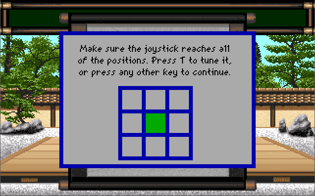 You can play Budokan: The Martial Spirit using either the keyboard (Q-W-E, A-S-D, Z-X-C and Left Shift key for action), numeric keypad (1-9 and Right Shift key for action), or joystick. To change the input device to use for either player, hit ESC at any time to display the Game Configuration window and hit '1' or '2' to choose that player. If you choose joystick as an input device, the calibration screen will appear where you can see if all joystick movements behave as you would expect. If they don't press 'T' to calibrate: