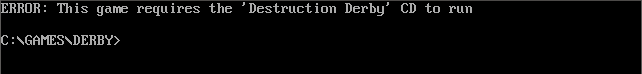 Destruction Derby must be installed to your hard disk (see How to Setup), but also requires the game's CD-ROM to be present when playing the game (it plays its music audio files off the CD). If you fail to insert the game CD into the drive you will receive this error: