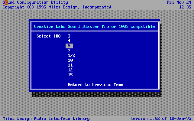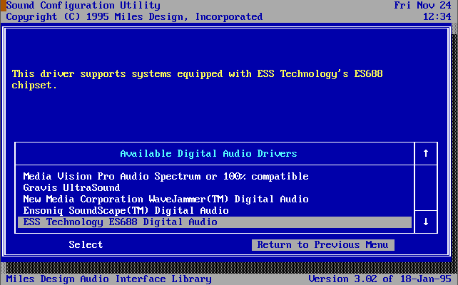 Audio Support: Sound Blaster/Pro/16/AWE32, ESS ES688, Gravis UltraSound, Pro Audio Spectrum, Roland RAP-10, New Media WaveJammer, or Ensoniq SoundScape.