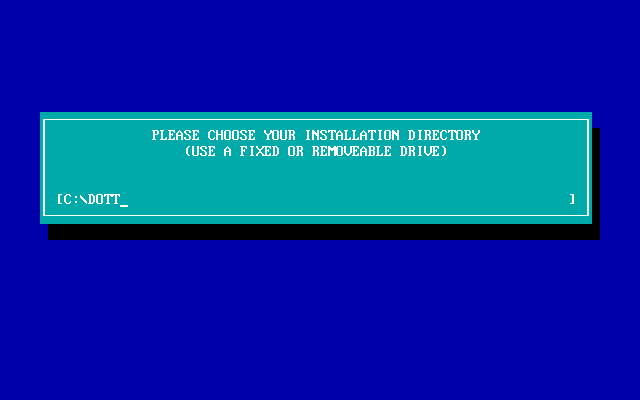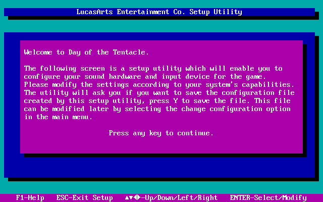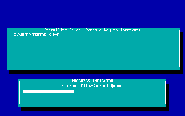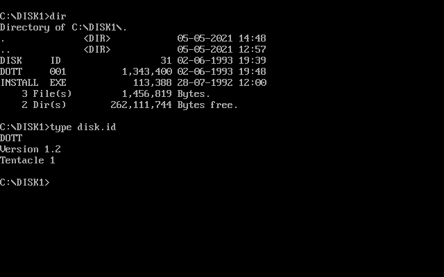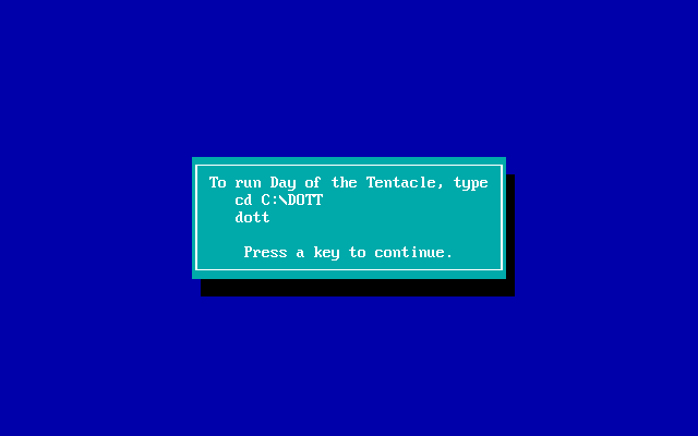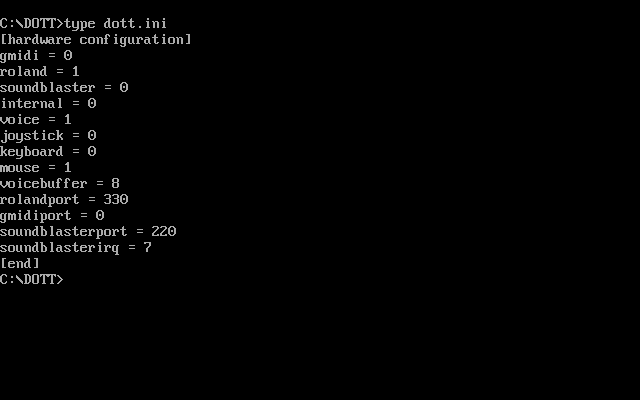 Resolution: Download this DOTTCD.EXE file, and extract it to your DOTT.CD game directory. The DOTT.CD directory is created the first time you save a configuration in the 'Change Configuration' screen. Then re-run the game from this DOTT.CD directory. Note that apparently this will disable MIDI sound so if you want to use General MIDI or Roland, *only* install the Roland file - perhaps extract the contents to a temporary directory first, then take the roland file across to DOTT.CD.