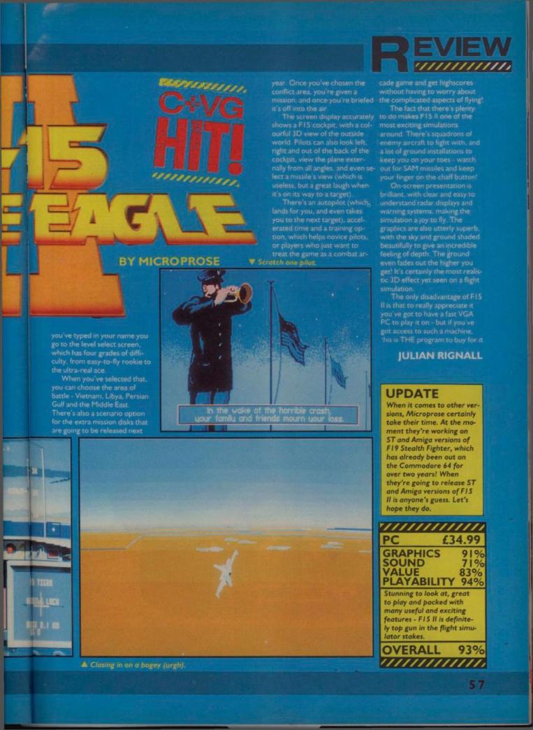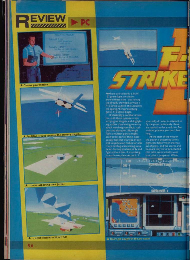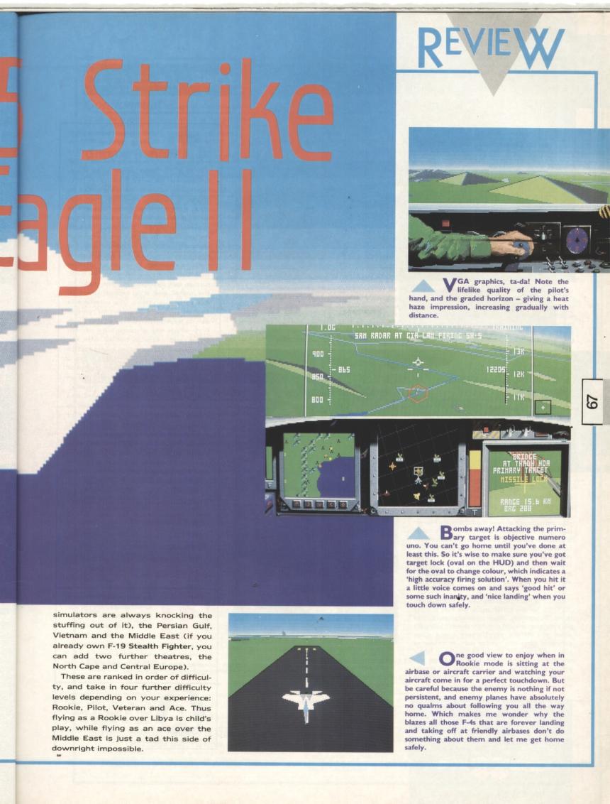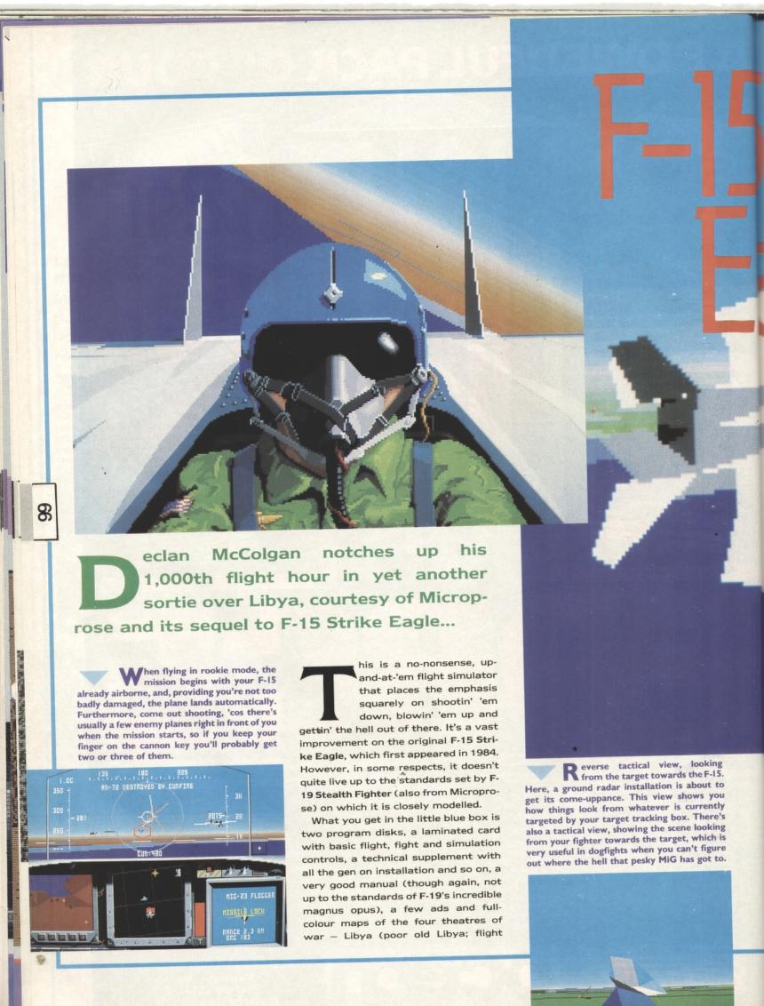 F-15 Strike Eagle II was the successor to MicroProse's much earlier F-15 Strike Eagle from 1985, although the game has much more in common with F-19 Stealth Fighter, which was released a year earlier. Both games use the same flight simulator engine, but in F-15 SE2, this has been enhanced with 256-colour graphics. There are four different theatres of war and now 11 camera angles including a few extra "Director's Mode" ones like seeing SAM sites launch missiles, and a view from your missile as it heads toward its destination.