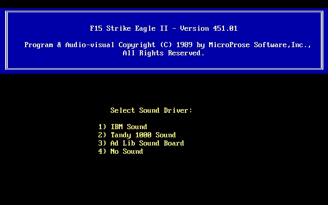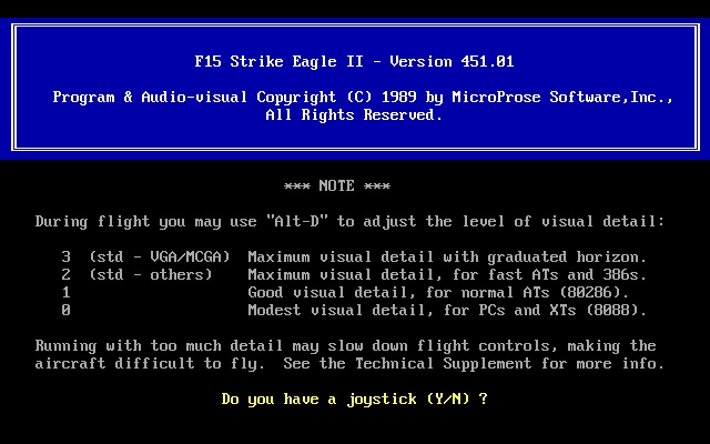 The game does not come with a setup program. Instead, simply running the F15.COM file to start the game automatically takes you through some setup options each time. You are prompted for the following: