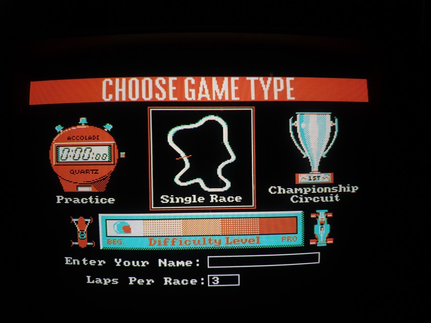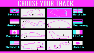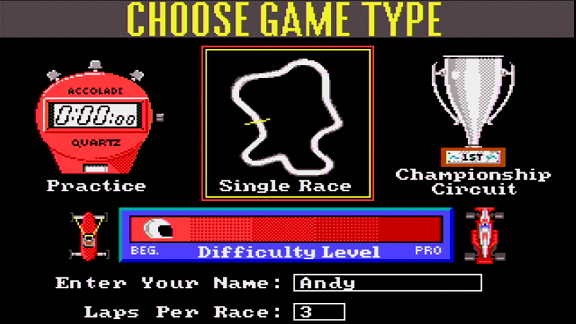 Grand Prix Circuit from Accolade is an arcade-style Formula 1 simulation, released in 1988. With 8 tracks to choose from and 3 cars you could take part in a single race or enter the Championship with a goal for glory. Each car has different characteristics ranging from easy to control and slow, up to fast but difficult handling.