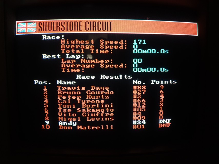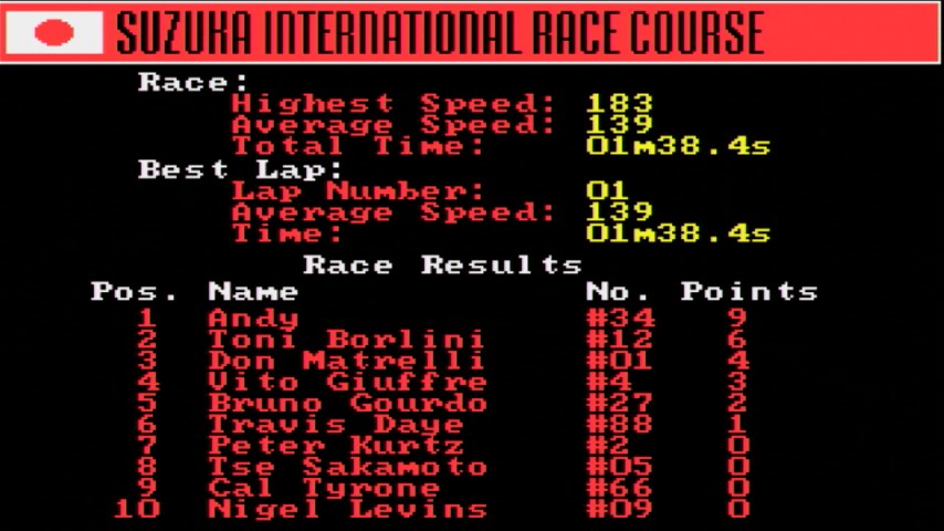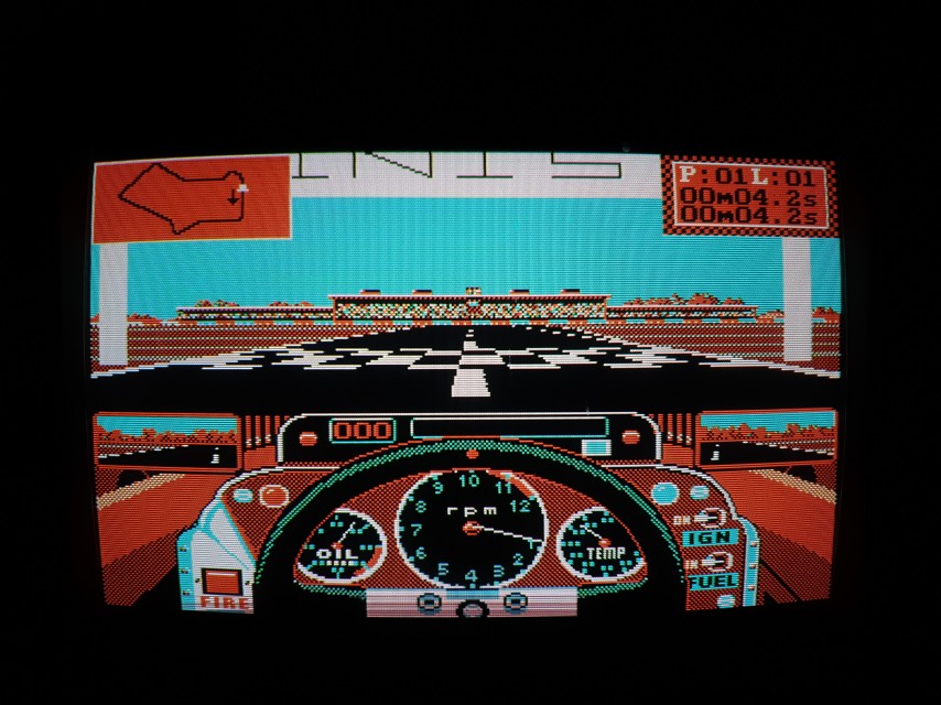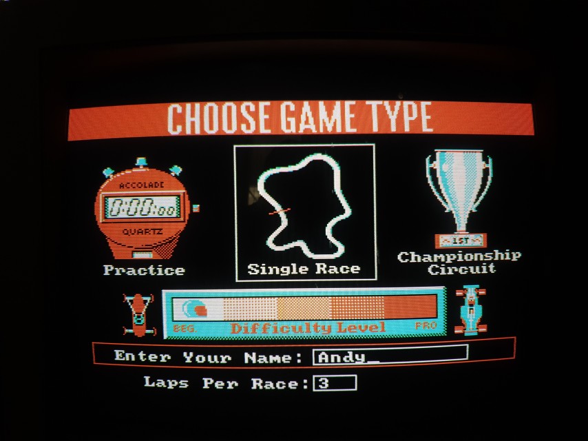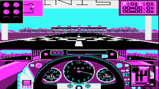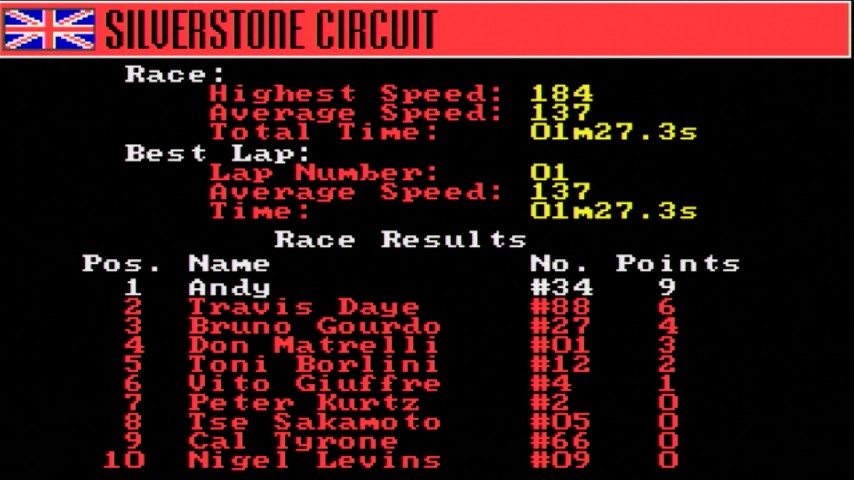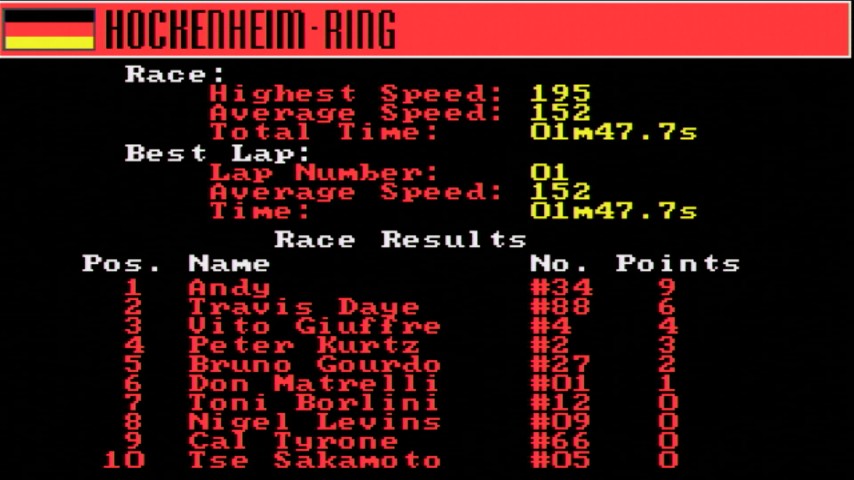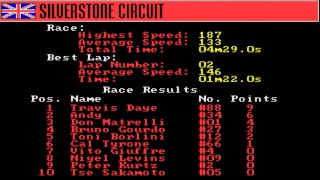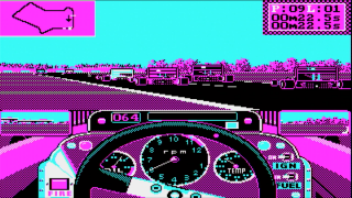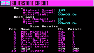 Sound: Hmm, not great here. It's PC speaker sound only, and no 3-voice audio for Tandy owners. Kris Hatlelid did a passable job of the main theme using the single-channel PC speaker, and given this hardware limitation the in-race sounds are also acceptable with usefully recognisable revs of the engine and the squeal of tyres when you're about to lose it. Shame they never provided an Ad Lib option. 4/10