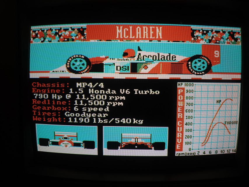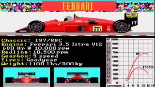 Grand Prix Circuit gives you the option of racing in 3 different Formula One cars: Ferrari 187/88C, Williams FW12, and McLaren MP4/4. That's in order of power/difficulty, so the Ferrari has best handling of the three but is a bit slower. The Williams is middle of the pack speed-wise and also with handling and braking. Finally the McLaren is the fastest, but is therefore more difficult to drive when it comes to handling, braking, etc. It makes sense based on the 1988 season, as the McLaren Honda car was just unstoppable. In 1987, the Williams Honda car was pretty exceptional, and over both years, the Ferrari picked up a few wins here and there.