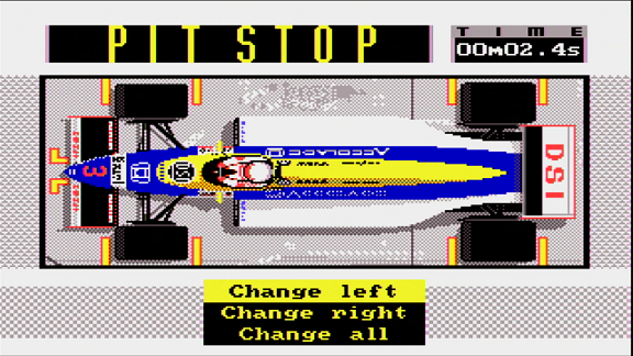When in a race where damage is a factor, you will need to pit. Just drive in between the two white lines and stop your car to enter the pits. You can select between changing only the left or right tyres, or all tyres.